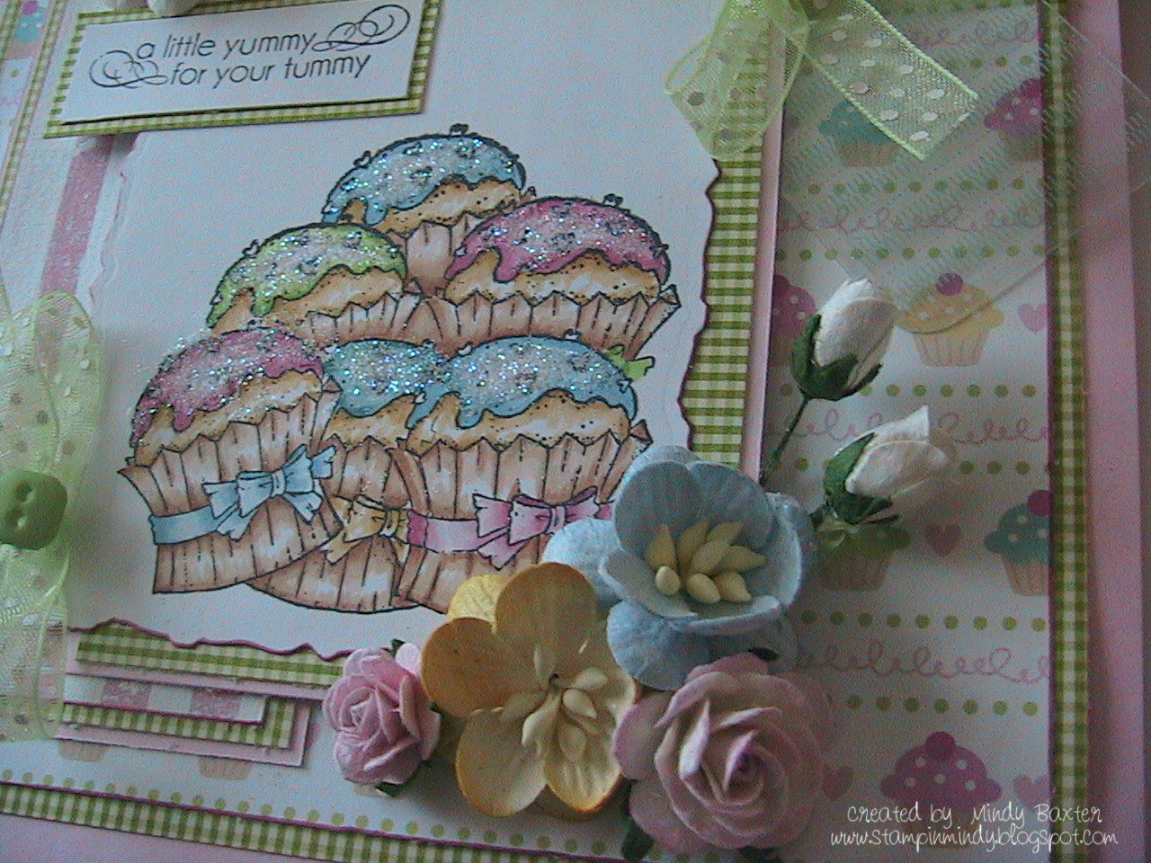 Adorable, sweet, luscious, delicious... these are the words I think of when I look at your card.. those cupcakes look so real and love the layout and your coloring and the bling on your card.. just so great.. Another precious card from Mindy... Hope your shoulder feels much better as each day passes...